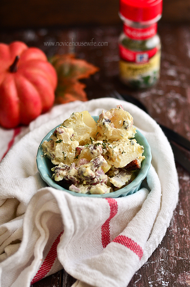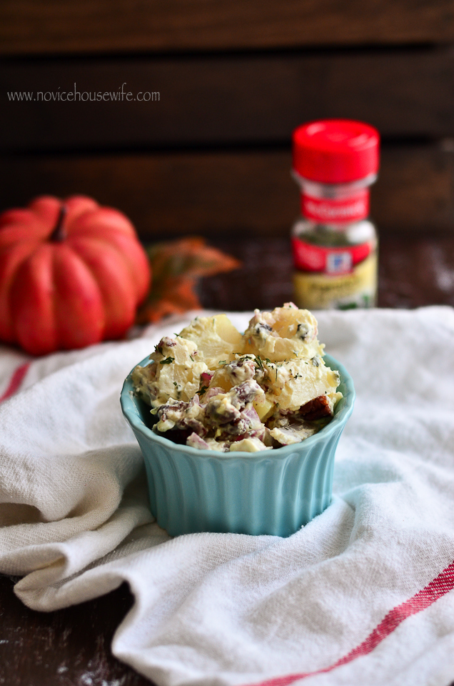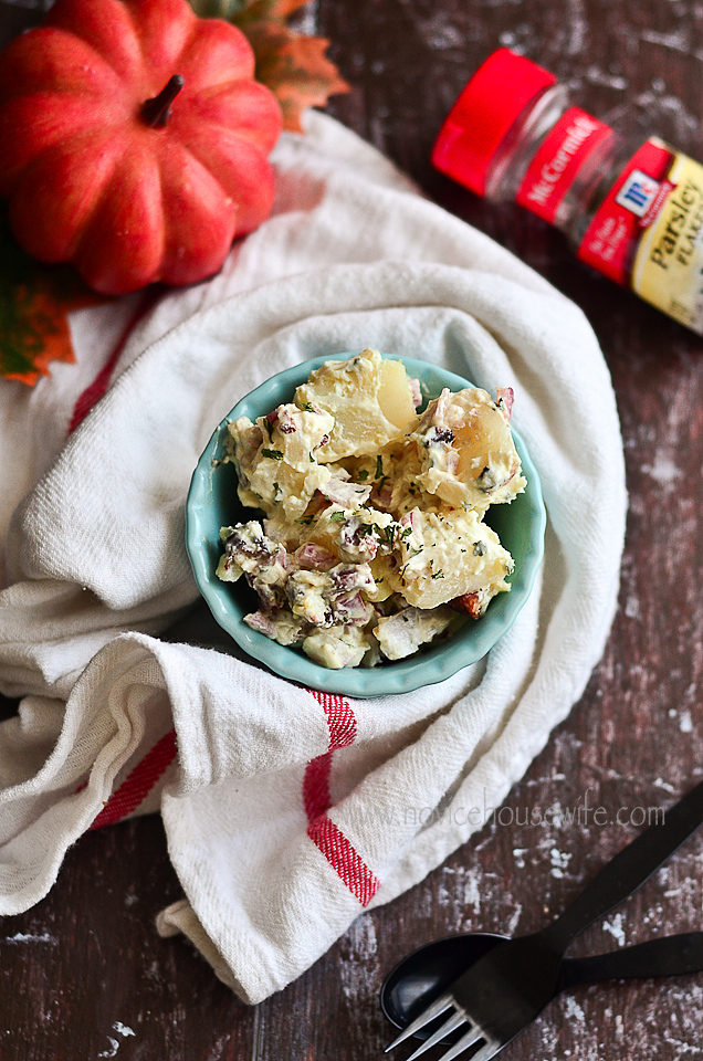 My mom used to make this really creamy russian salad when I was younger and serve at parties. It would always get rave reviews. She never put potatoes in the salad, which now I find odd because Russians love their potatoes, so I am assuming a salad called Russian, should have that starchy root. Anyway, my mom’s didn’t but it was still really good. I called my mom to ask for the recipe. I also remember her making this potato walnut salad and somehow the conversation went to that salad, and how good it was- the end result, I ended up making a potato walnut salad instead of my mom’s russian salad.